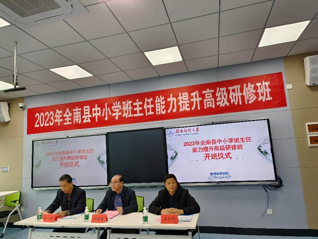 12月16日,2023年全南县中小学班主任能力提升高级研修班开班仪式在第十一教学楼402教室举行。全南县教体局师训科科长巫宏斌、赣南师范大学继续教育与培训学院党委书记刘建春、德赢vwin8868官网院长邱小健等领导出席开班仪式,来自全南县的50位班主任参加了此次培训。